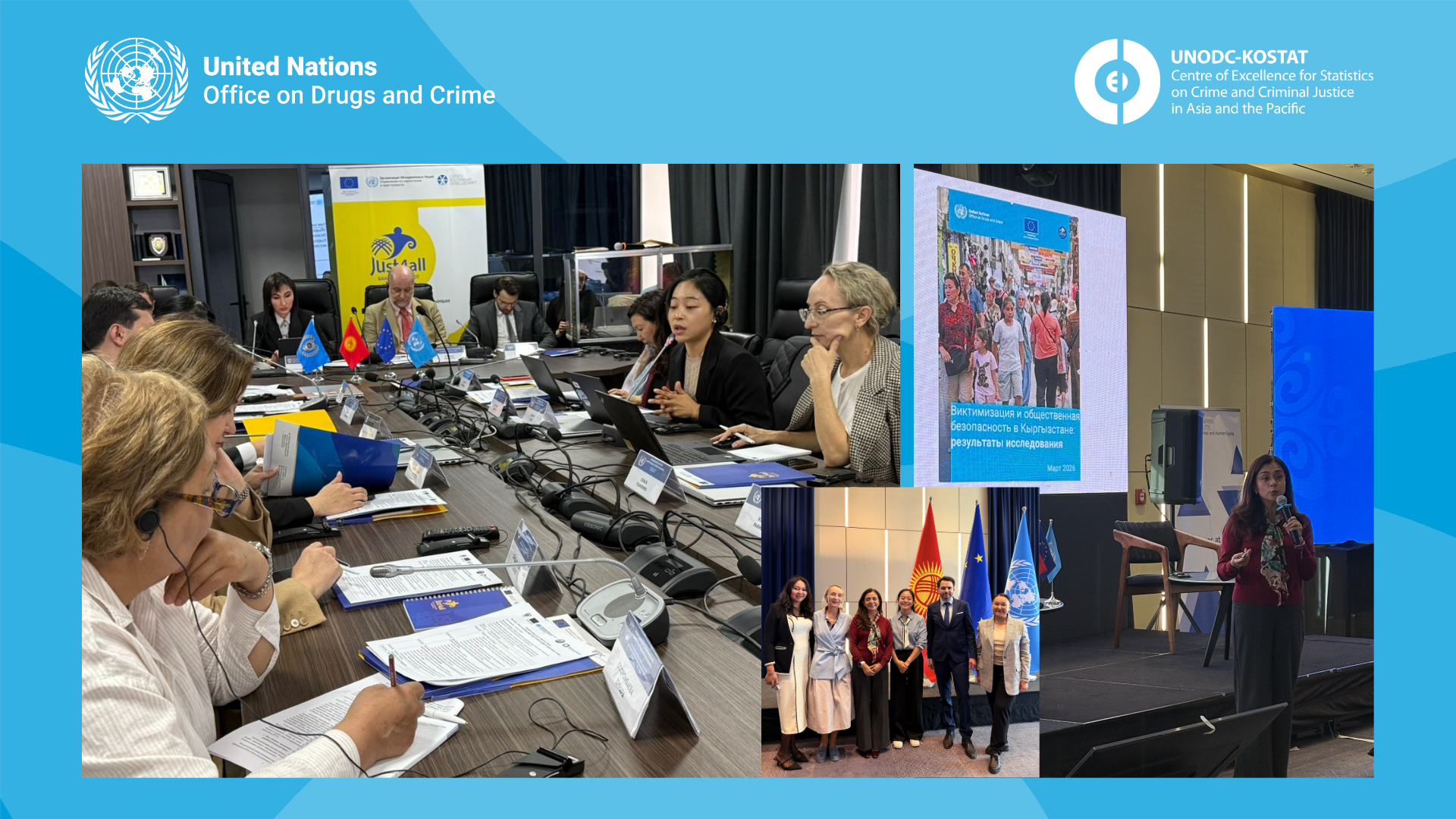 Bishkek, Kyrgyzstan, 24-25 March 2026 – The UNODC-KOSTAT Centre of Excellence (CoE) has been supporting Kyrgyzstan in implementing a nationwide crime victimization survey in collaboration with the UNODC Information Centre, as a part of the JUST4ALL project that supports justice sector reform in the Kyrgyz Republic. To present preliminary findings of the 2025 Kyrgyzstan Victimization and Perception on Safety Survey (VPSS) and gather comments and feedback from national stakeholders, the CoE participated in a roundtable discussion and a closing event for JUST4ALL.